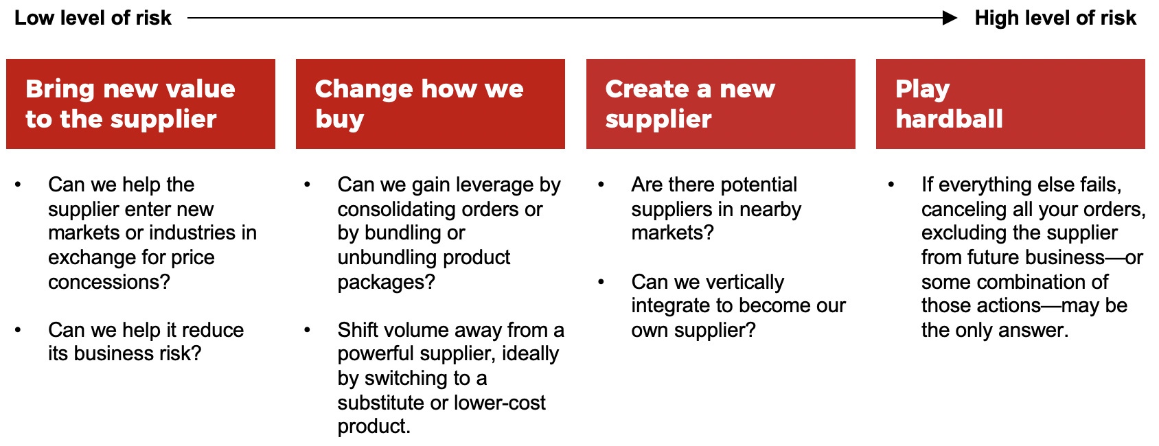 Companies should start by assessing whether they could support the supplier by bringing new value to the supplier. If not, they should consider whether they could change how they buy. They should then look at creating a new one. If all else fails, they must consider playing hardball.